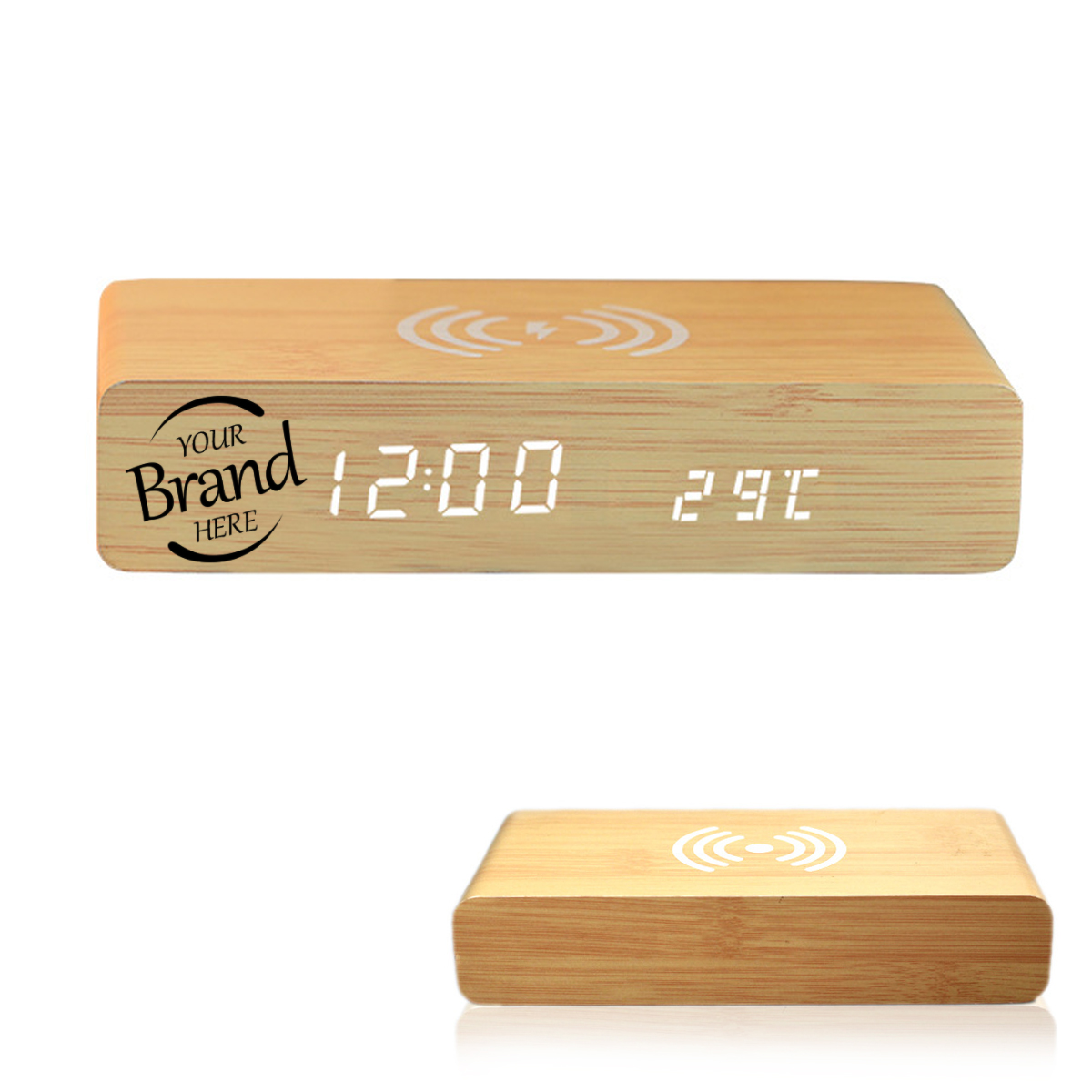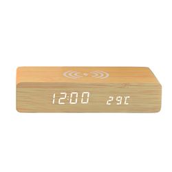 Made of wood, this wireless charing alarm clock support fast charging and charges universal cellphones with wireless charging in high efficiency way without overheating, which is really handy and space saving while keeps your bedside nightstand neat and clean. Conveniently charge your phone while it is placed on the alarm clock, supporting most universal Wireless Charging cellphone models. It's not only a clock,an alarm clcok,a wireless charger,but also a great decoration for your bedroom or office. Measured 6.41"*2.95"*1.25". Bamboo wood color for your choice. Customize your logo or brand name on the front to boost your brand awareness!