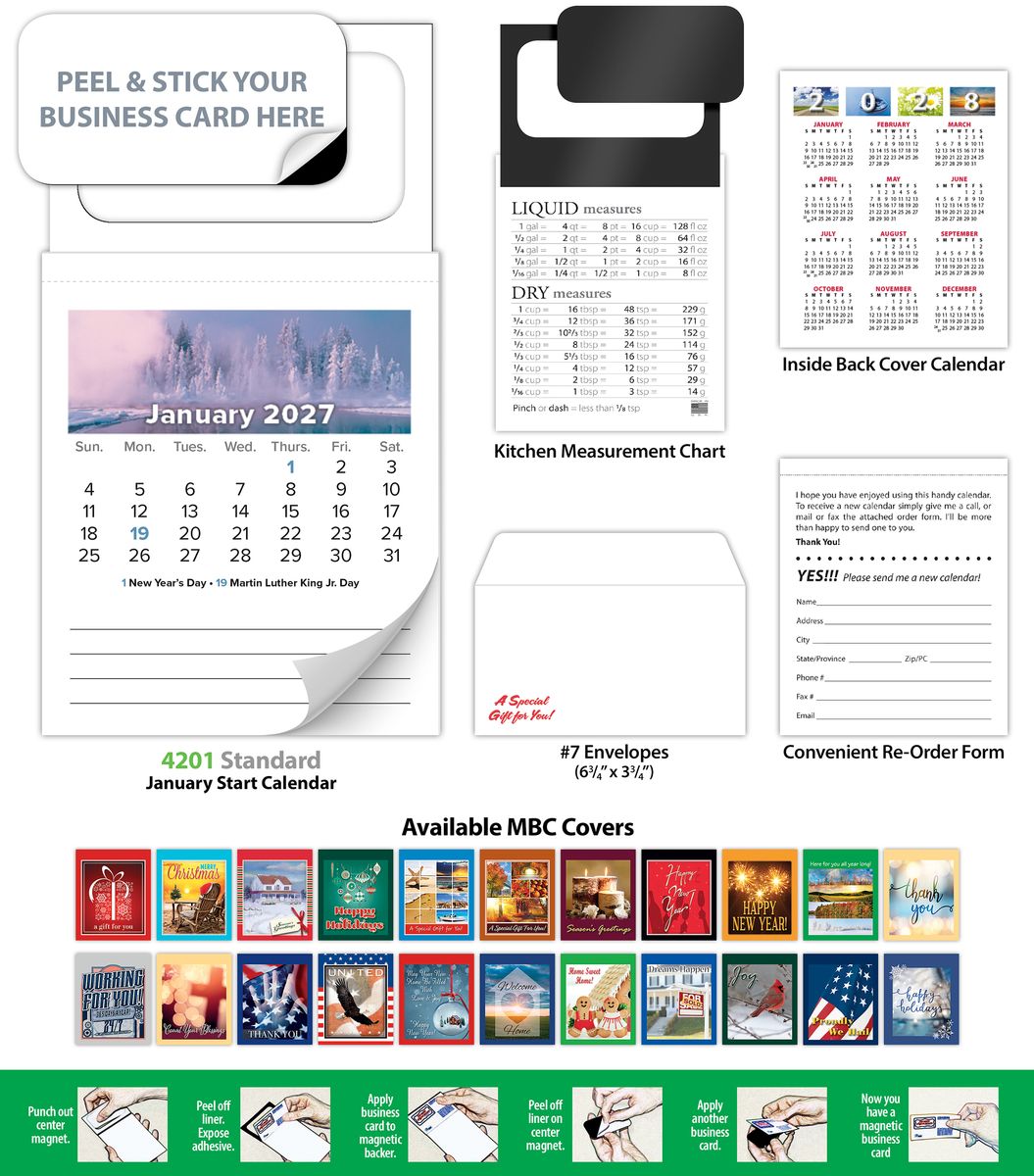 Keep an inventory on hand for the entire sales force to use. Everyone uses a calendar. Attach your business card to this 12-month magnetic business card (M.B.C.) calendar and leave a lasting impression with your customer. Your name and contact information will be easily accessible for quick reference. Buy for your whole office and share.